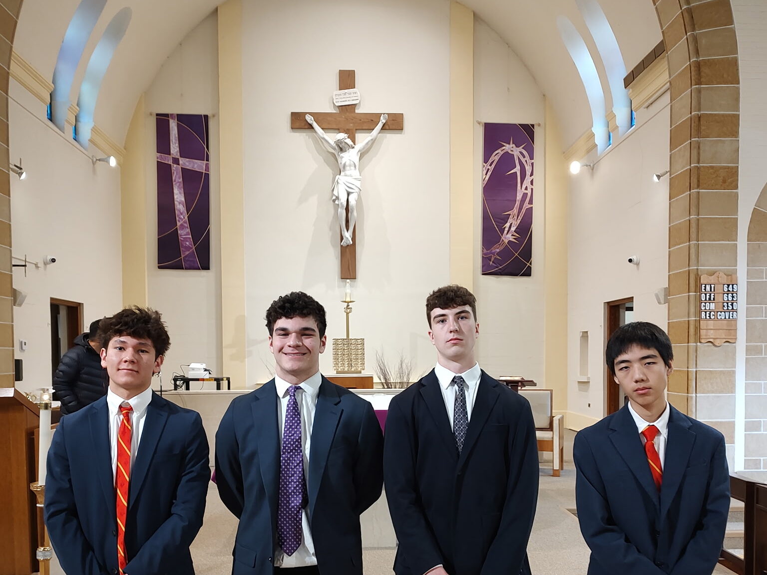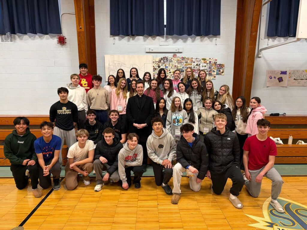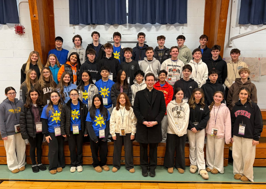 Fr. Christian and Br. Gabriel (Bergen Catholic HS Campus Ministry) with (L-R) Ryan Park, Luke Stein, Owen Anderson, Dylan Carrick after the Rite of Election. All are looking to receive Sacraments of Initiation at the Easter Vigil. (Feb. 2026)