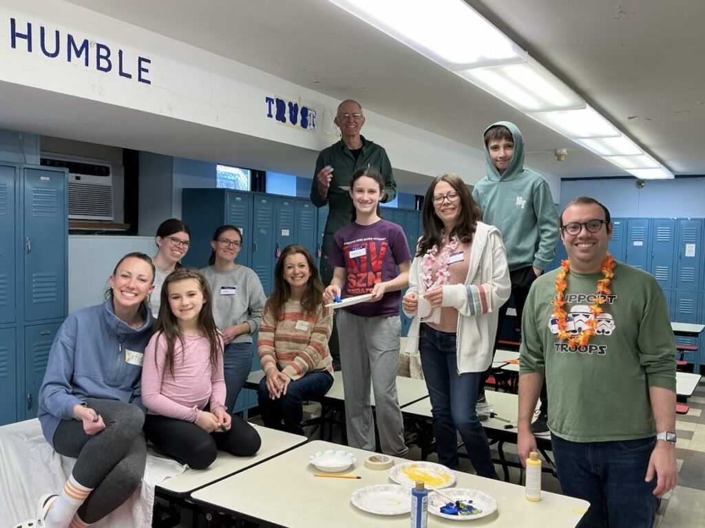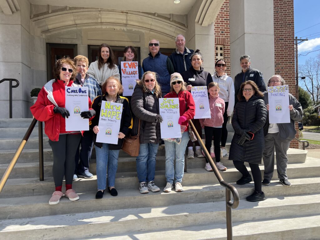 The Parish Day of Service volunteers gathered for a blessing from Fr. Christian before heading to 1 of the 7 service stations (Care One Nursing home table decorations; Eva’s Village hygiene packages, New Hope pregnancy resource center gift baskets for new moms, Sgt. Solinas Memorial unit care packages, SJS kitchen cleaning, SJS mural painting; and rosary making/prayer) and our annual Palm Sunday Weekend Food Drive! (Mar. 2026)