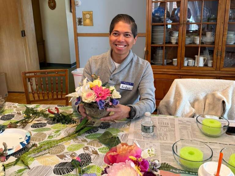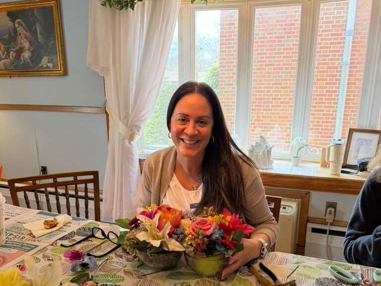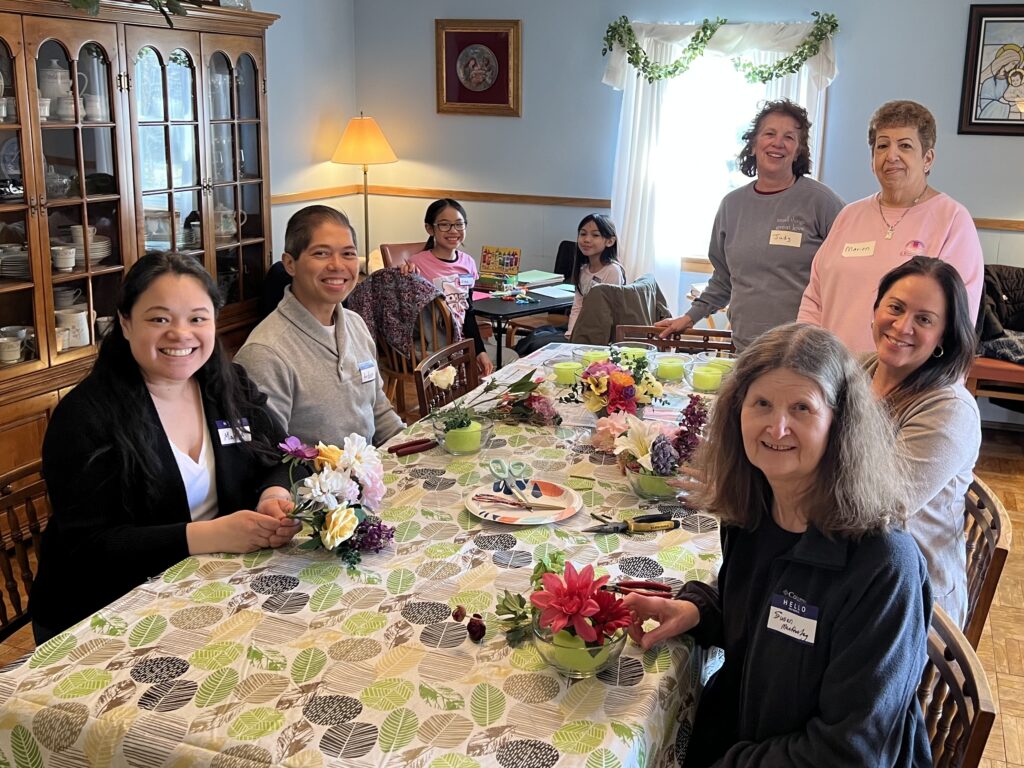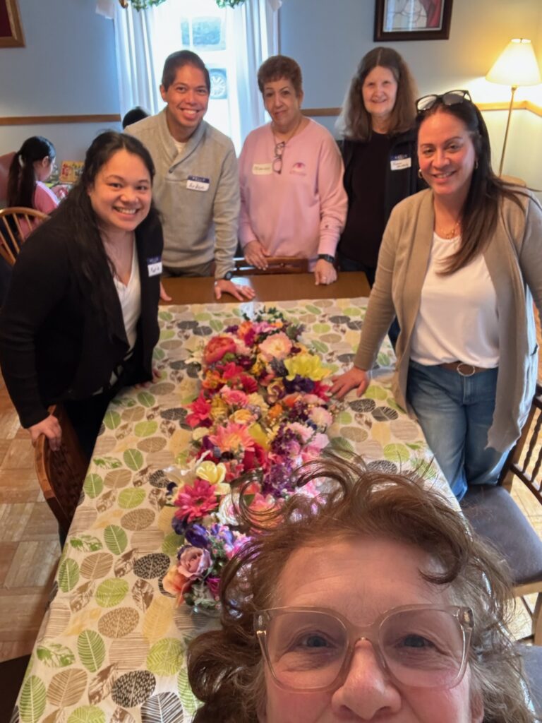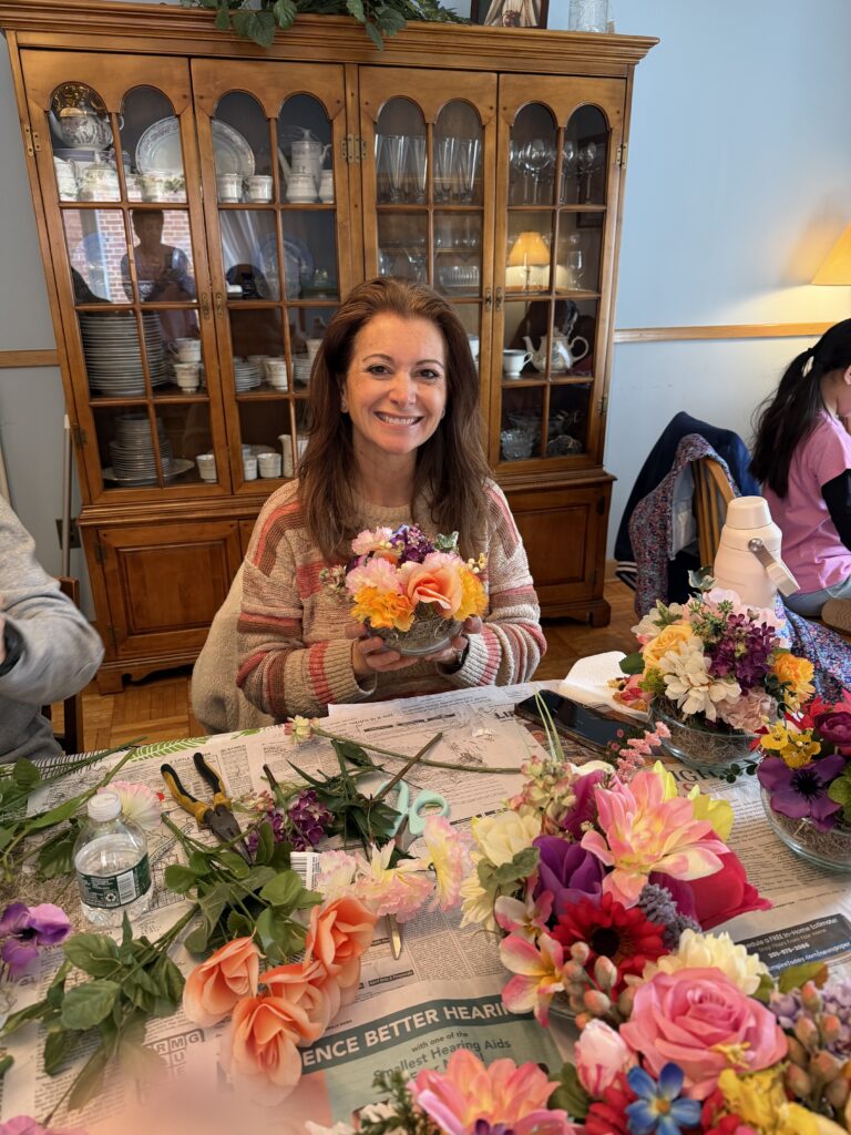 Volunteers led by Judy Rosenberg and Marilyn Flotard created beautiful floral centerpieces for CareOne Nursing home in Oradell at the Day of Service (March 2026)