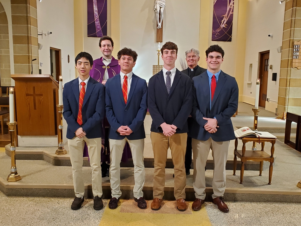 Father Christian celebrated the 2nd Scrutiny for the Elect who are preparing for Baptism at the Easter Vigil. Back row: Fred Fakharzadeh (OCIA team), Br. Gabriel (BCHS Campus Ministry), Owen Anderson, Dylan Carrick, Melinda Rabbia (OCIA Team)