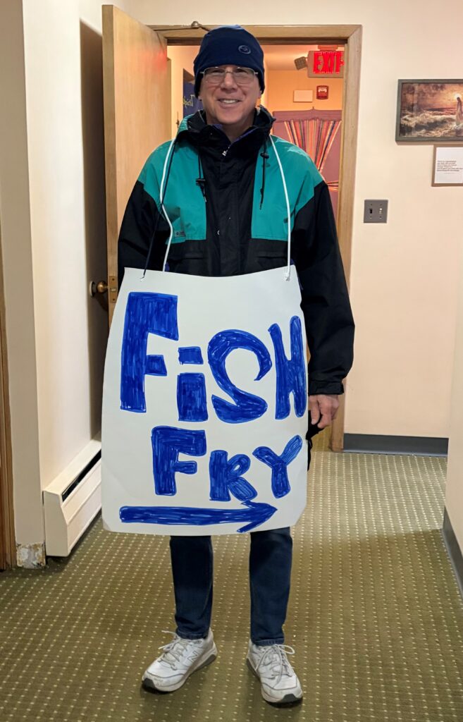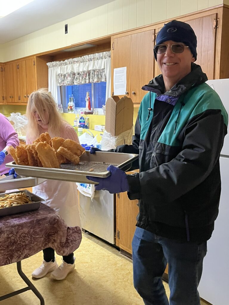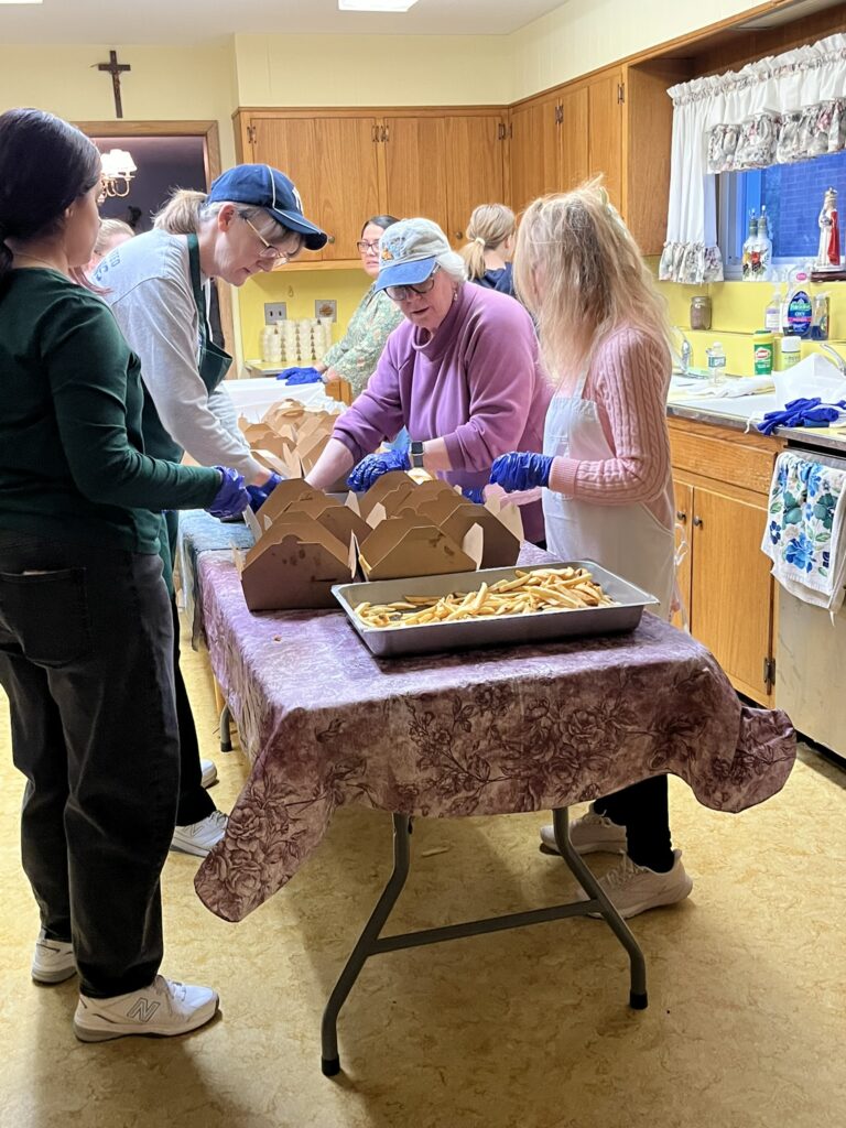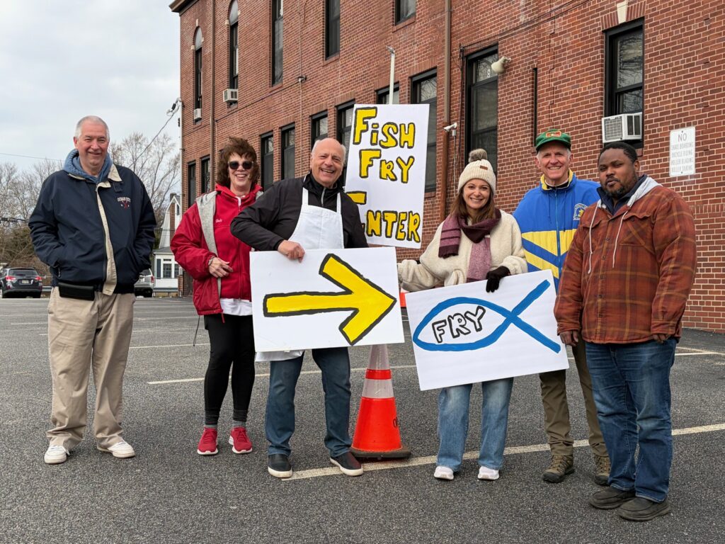 The parish Lenten fish fry was a huge success, thanks to all of the volunteers; almost 500 dinners were purchased! Pictured (L-R): Dave Bednarcik (PPC president), Judy Rosenberg, Phil DeRosa, Jane Kiernan, Mike Humiston, and Elisha Kiliko Mutinda (March 2026)