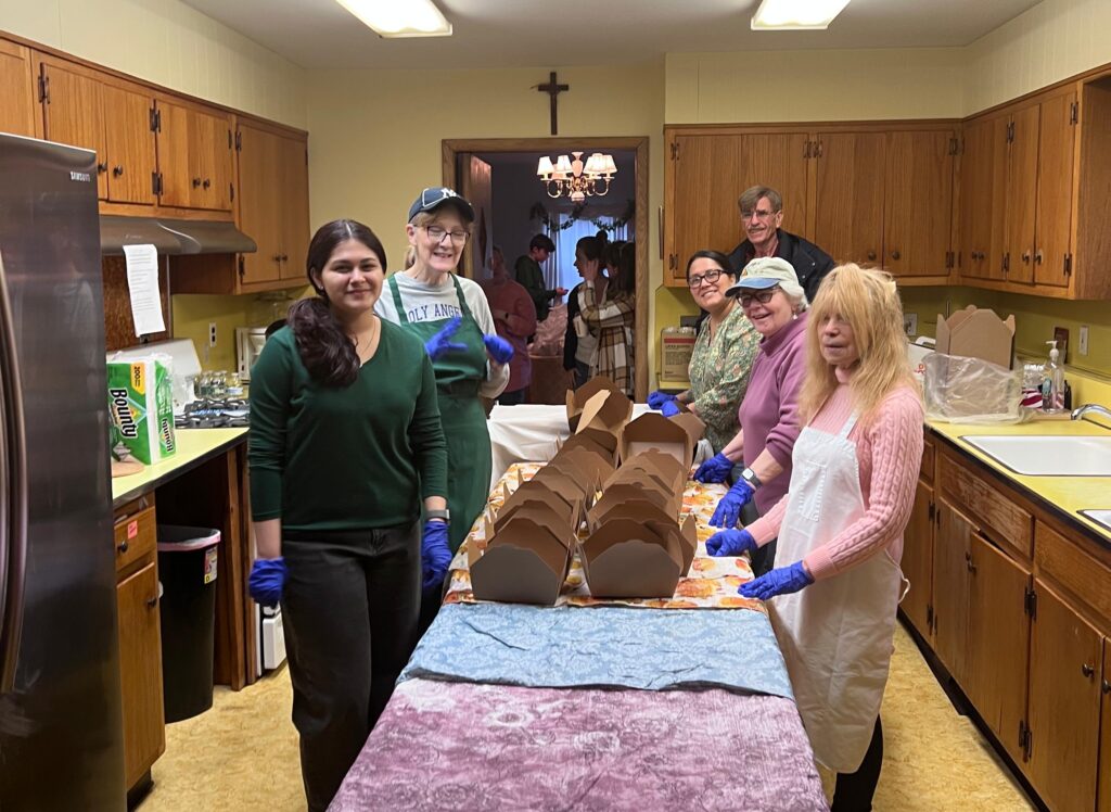Delilah, Felecia Braun, Martha Recio, John Fuhrman, Betty Kern, Carol Scalo working in the parish Retreat House kitchen