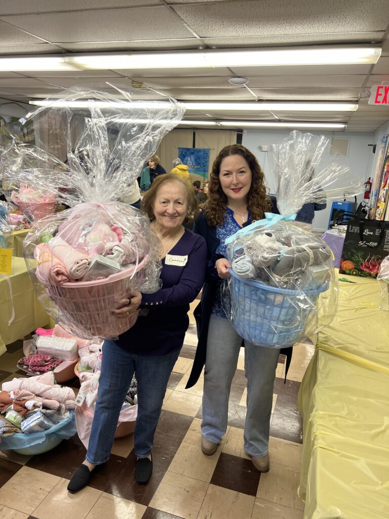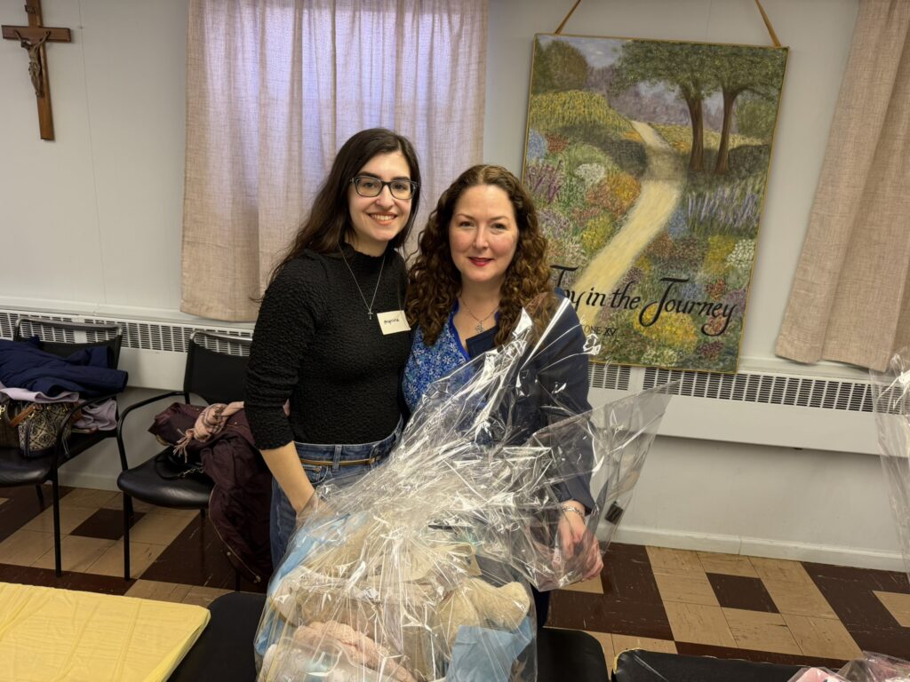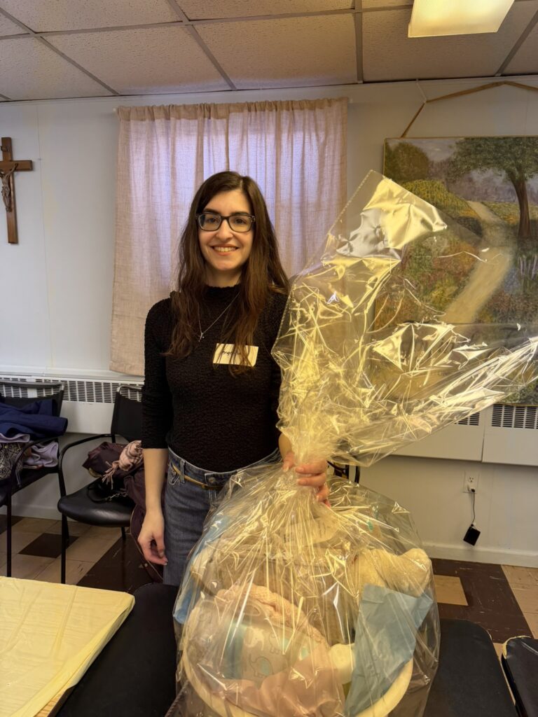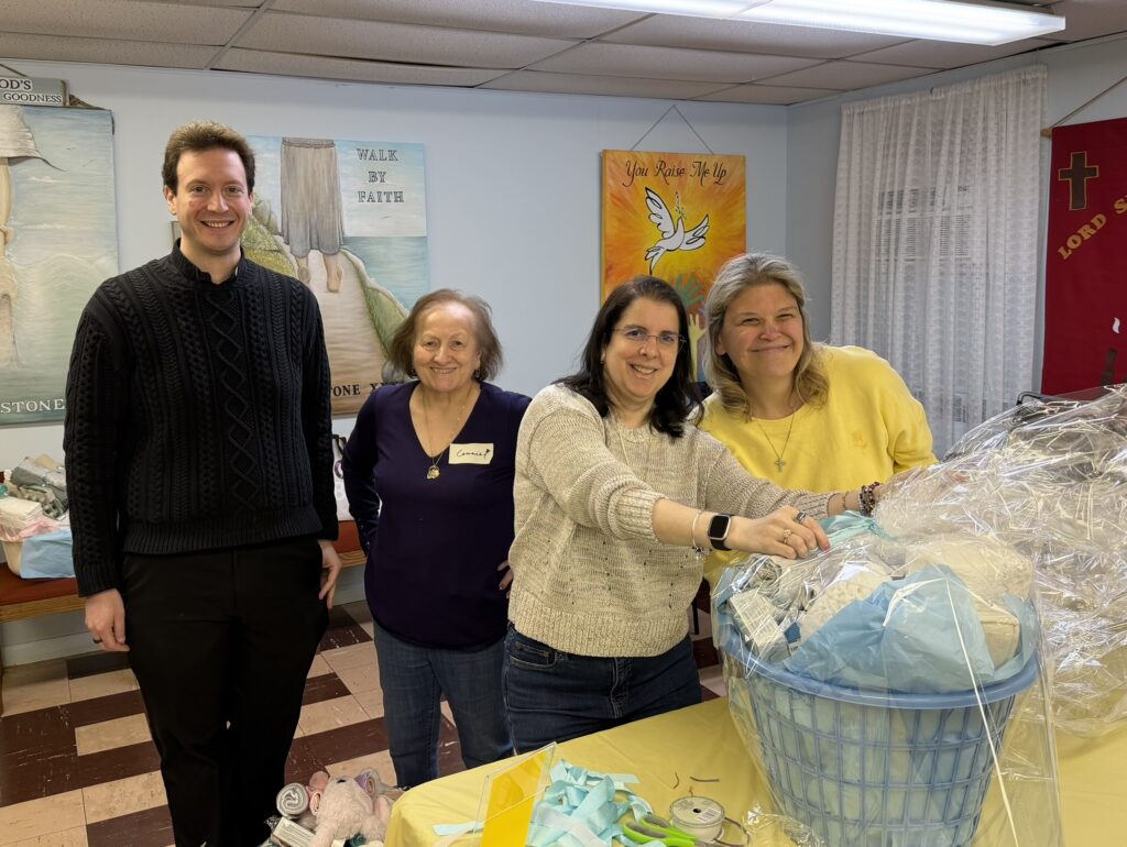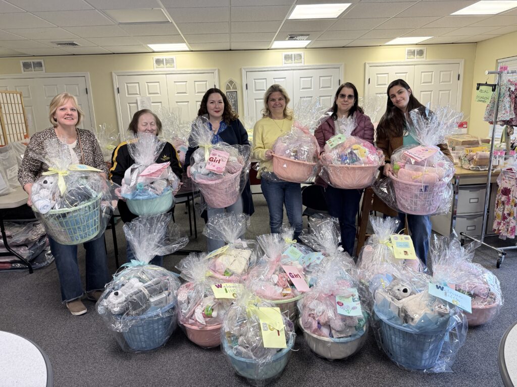Connie Vincenti and Melinda Rabbia co-led the effort to create 28 newborn baby baskets for moms helped by New Hope PRC in Westwood for the parish Day of Service (mar. 2026)