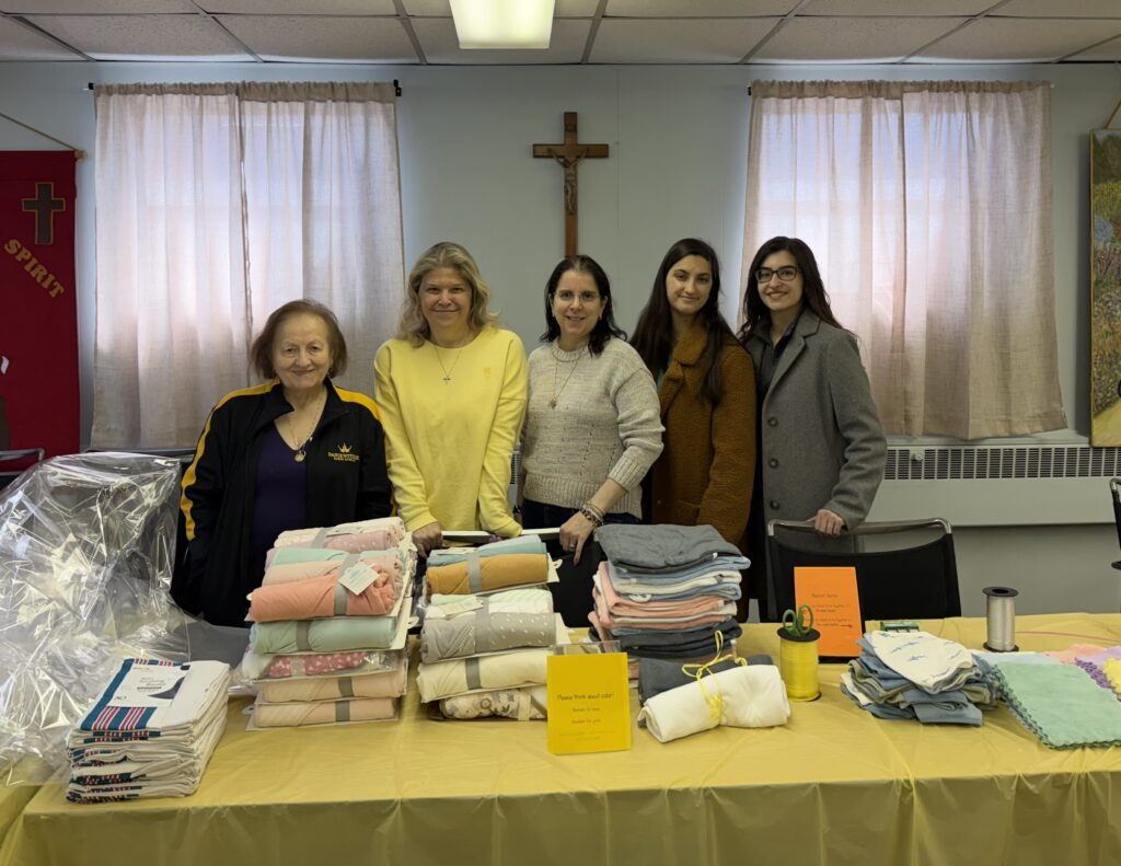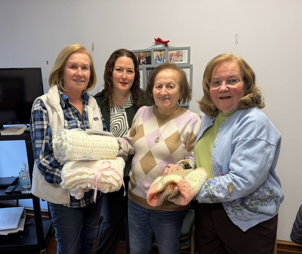 Members of the Shawl Ministry presented several beautiful handmade baby blankets to Melinda and Connie, members of the parish Day of Service Committee. The baby blankets will be included in gift baskets for new moms at New Hope Pregnancy Resource Center in Westwood. pictured (L-R): Anna Morgan (Shawl Ministry), Melinda Rabbia, Connie Vincenti, and Gail Fabiano (Shawl Ministry) (Mar. 2026)