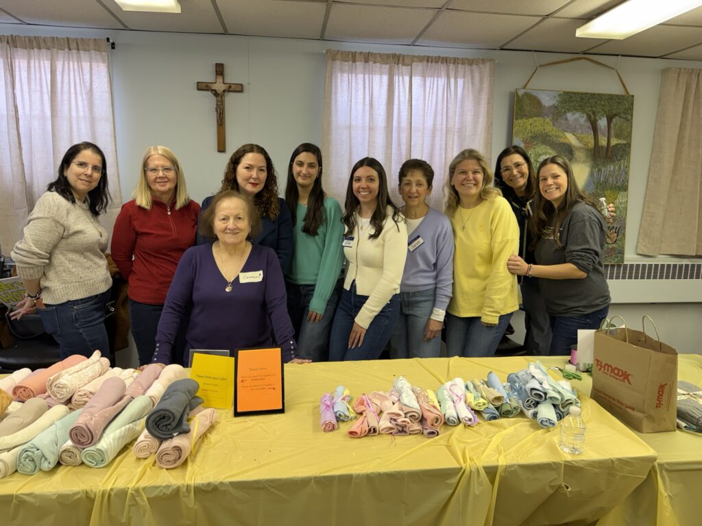 Kelly, Connie, and Cynthia organized 25 handmade baby blankets; Fr. Christian blessed all the handmade blankets which were made with love and prayers for the moms and their new babies.