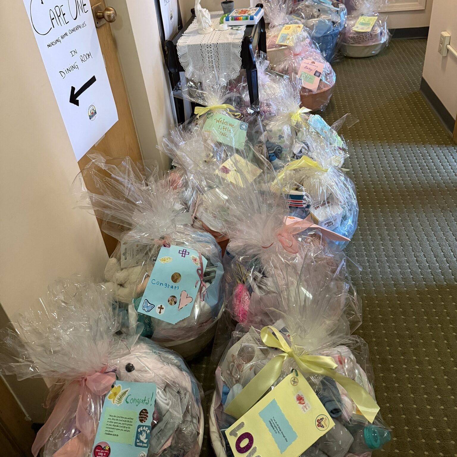 Baskets included diapers, wipes, handmade blankets, ointment, “onesies”, pacifiers, bibs, receiving blankets, hooded towels, washcloths, bottles, plush toys, etc.