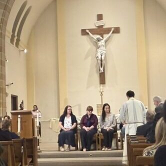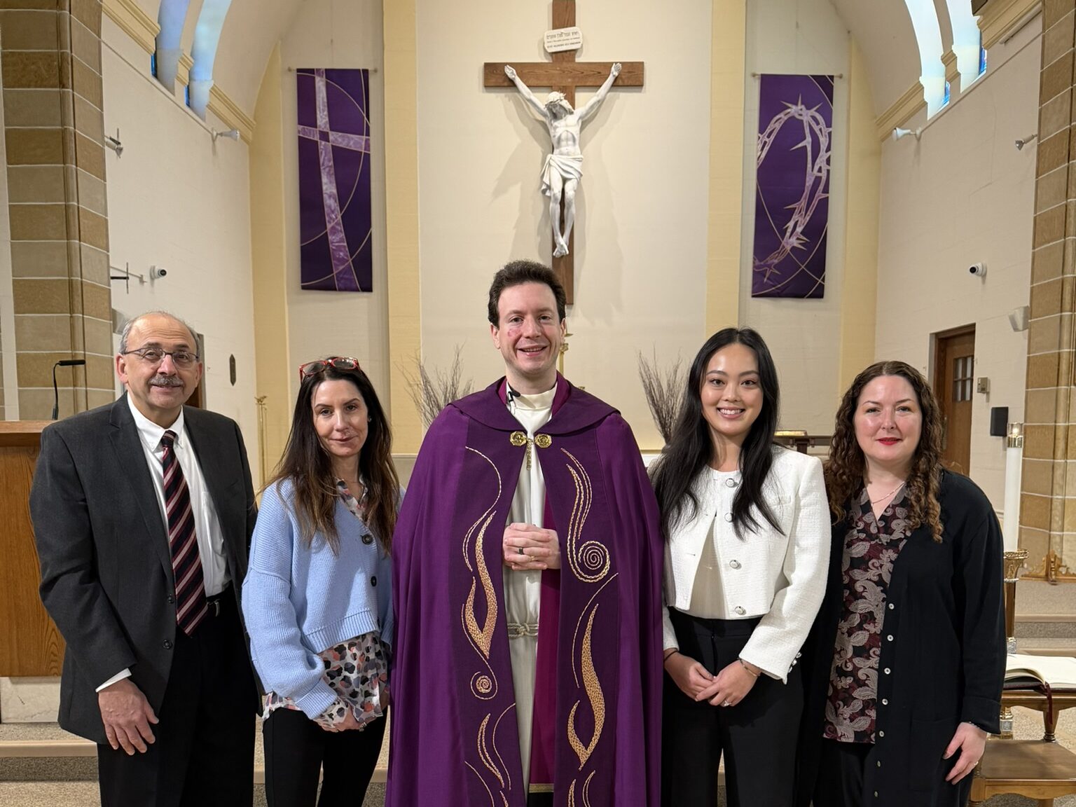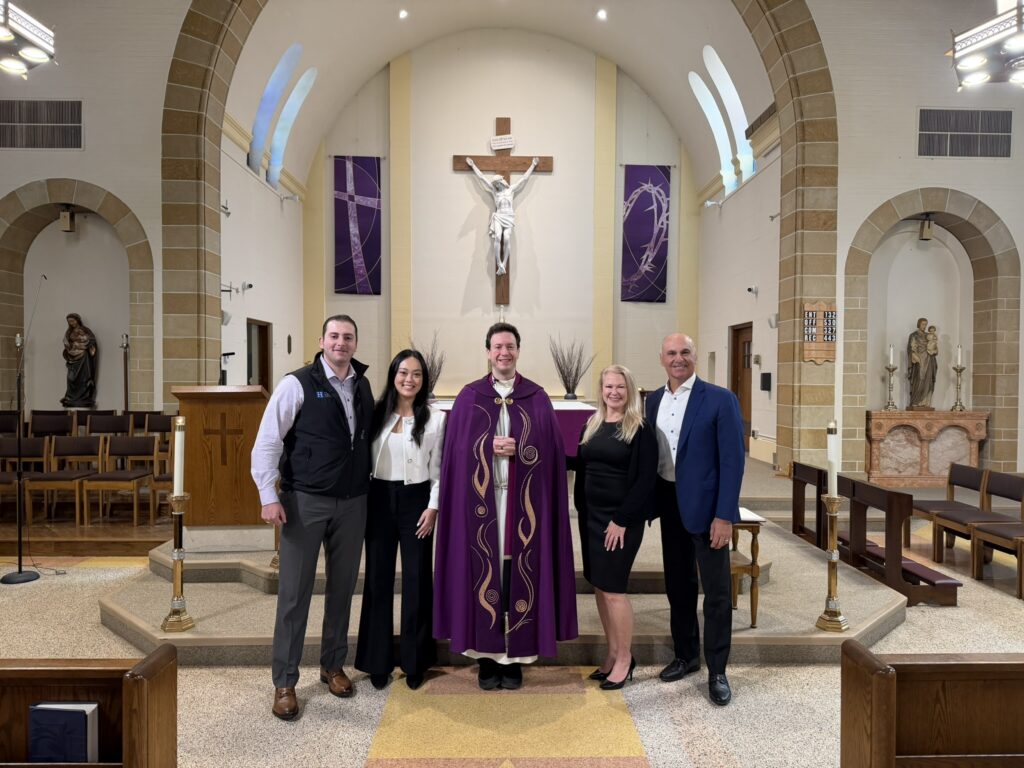 Fr. Christian celebrated the Rite of Election for Samantha and Joelle: Pictured (L-R): Fred Fakharzadeh (OCIA Team), Joelle Quilla, Father Christian, Samantha Du, Melinda Rabbia (OCIA Director). The women are journeying toward receiving the Sacraments of Baptism, Eucharist, and Confirmation at the Easter Vigil. (Feb. 2026)