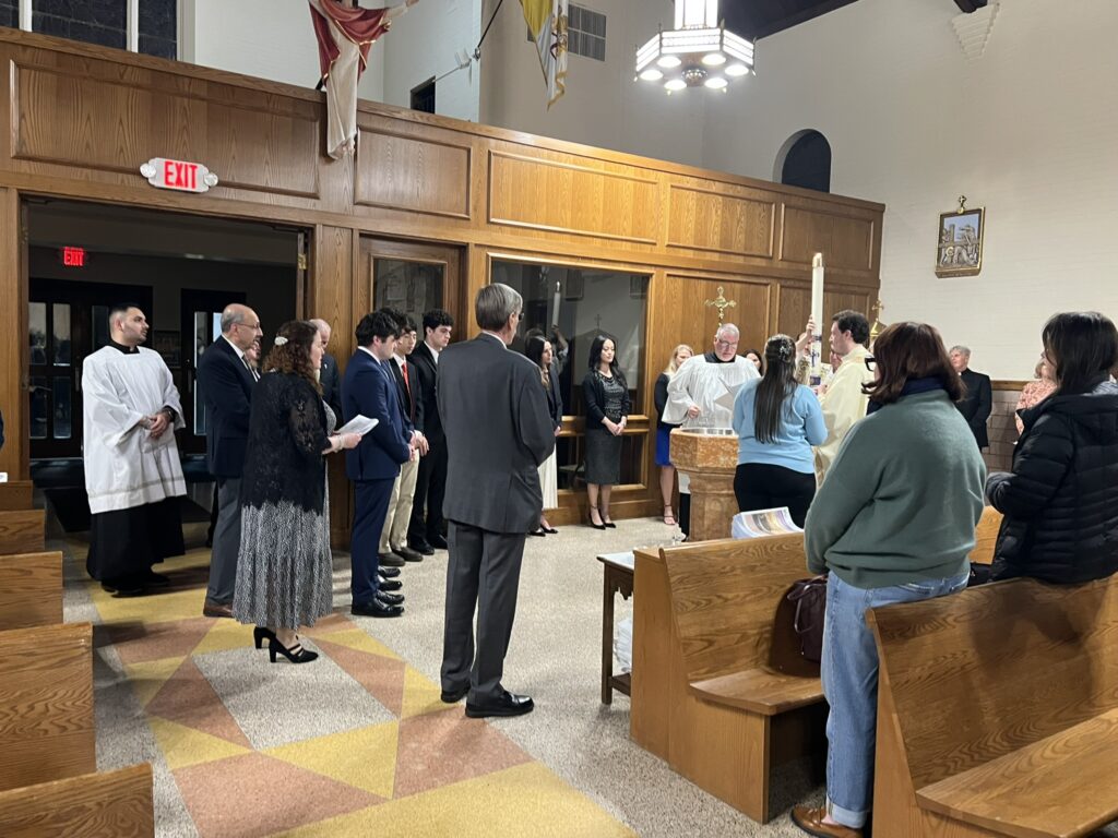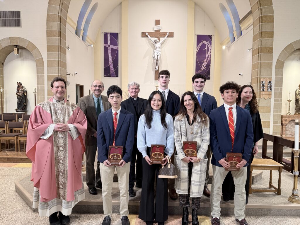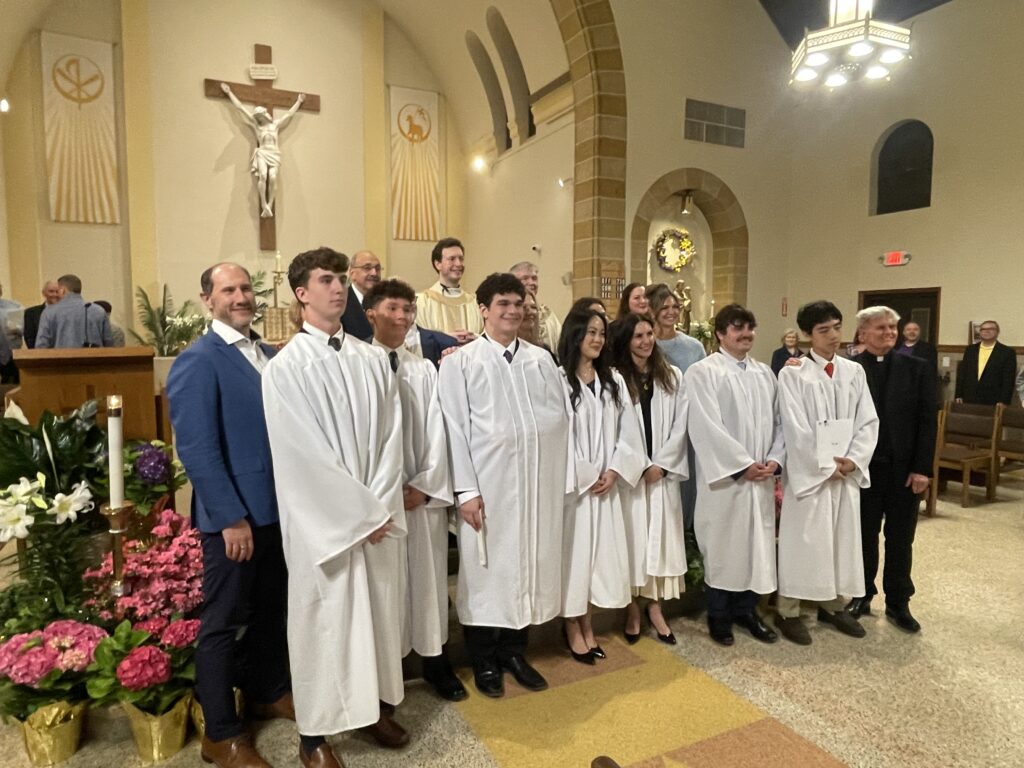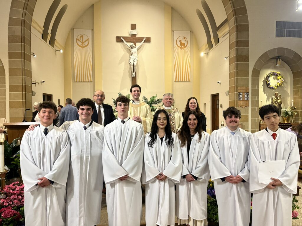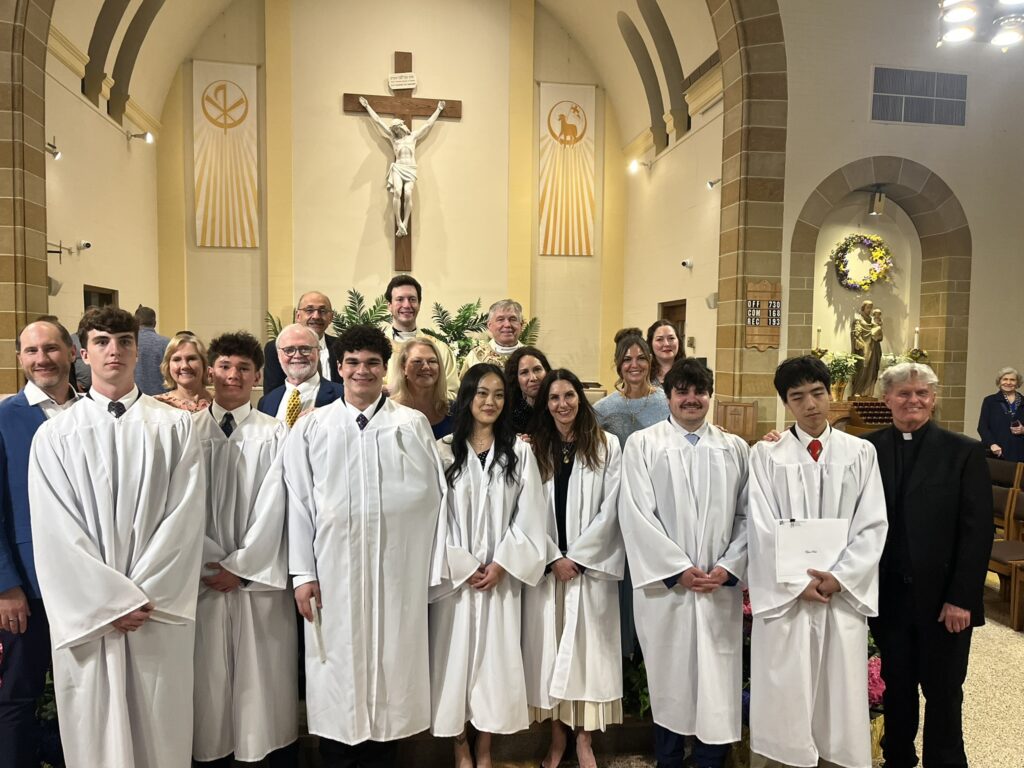 Father Christian celebrated the 3rd Scrutiny for the Elect who are preparing for Baptism at the Easter Vigil. The Elect are holding framed copies of the Lord’s Prayer. (Back row (L-R): Fred Fakharzadeh (OCIA team), Br. Gabriel (BCHS Campus Ministry), Father Christian Melinda Rabbia (OCIA Team); Front row (L-R): Kim Tarascio (Joelle’s sponsor), Joelle Quilla, Ryan Park, Luke Stein, Owen Anderson, Dylan Carrick, Samantha Du)