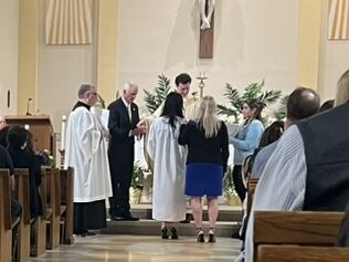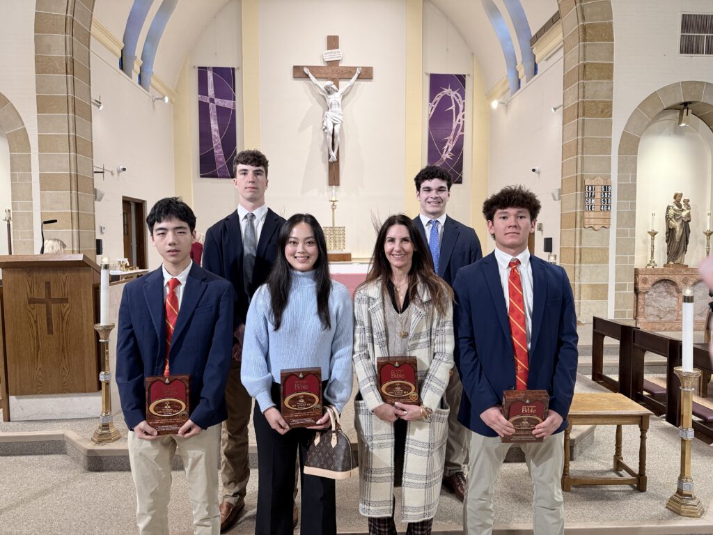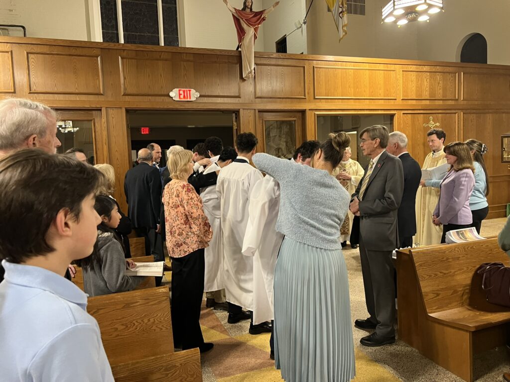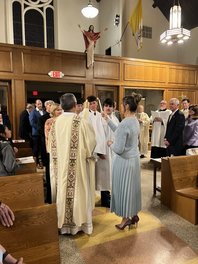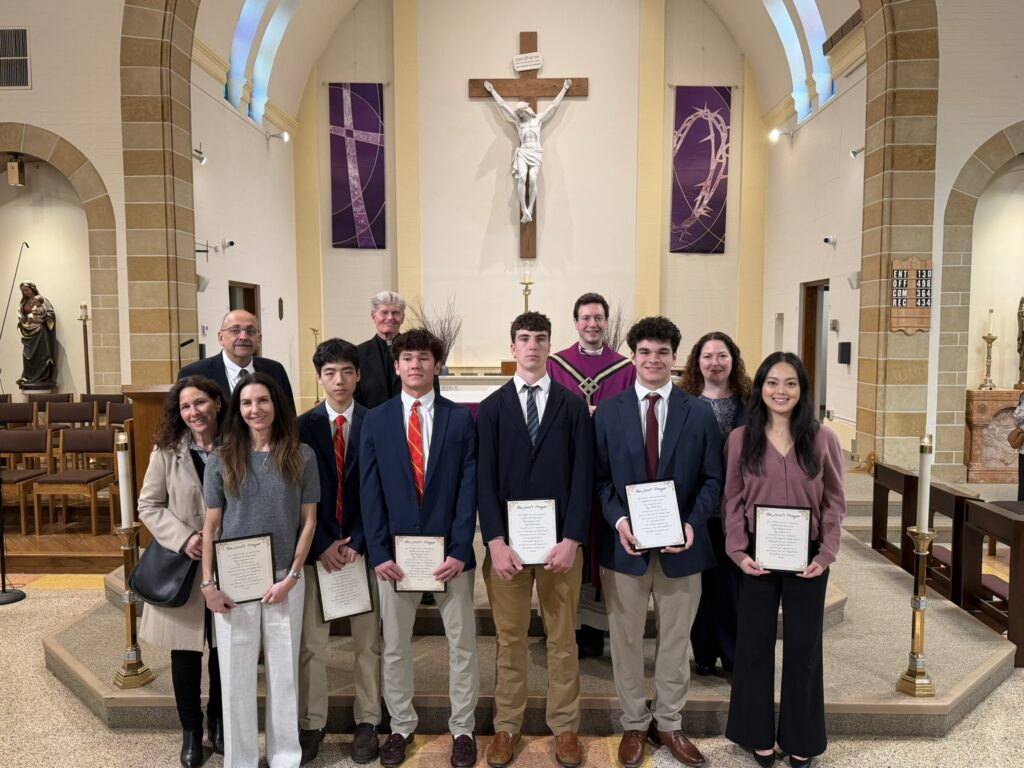Father Christian celebrated the 3rd Scrutiny for the Elect who are preparing for Baptism at the Easter Vigil. The Elect are holding framed copies of the Lord’s Prayer. (Back row (L-R): Fred Fakharzadeh (OCIA team), Br. Gabriel (BCHS Campus Ministry), Father Christian Melinda Rabbia (OCIA Team); Front row (L-R): Kim Tarascio (Joelle’s sponsor), Joelle Quilla, Ryan Park, Luke Stein, Owen Anderson, Dylan Carrick, Samantha Du)