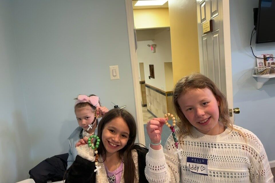 SJS fosters Marian devotion in elementary school students through its after-school Children’s Rosary Club. Legion of Mary members Patricia Fakharzadeh (R.) and Veronica Ocello (L.) lead the club every Wednesday. (Ash Wednesday – Feb. 2024)