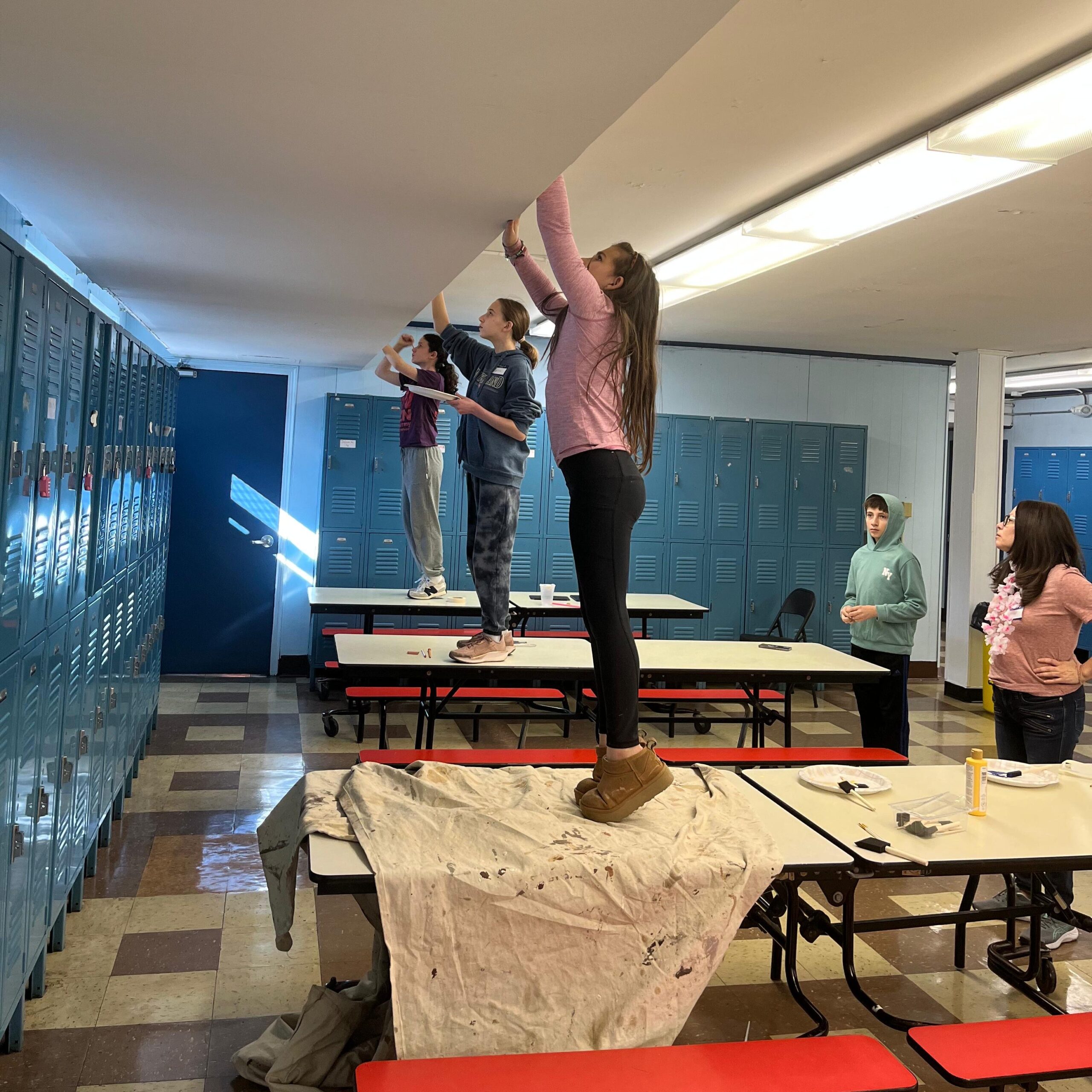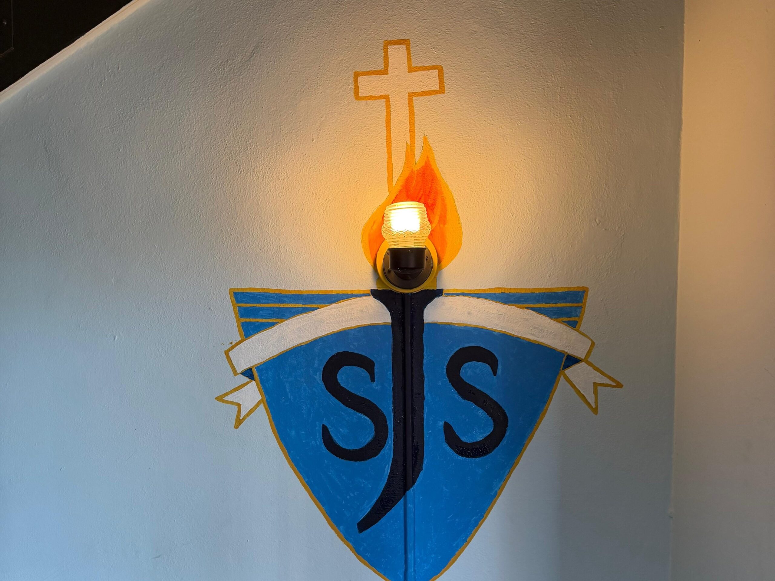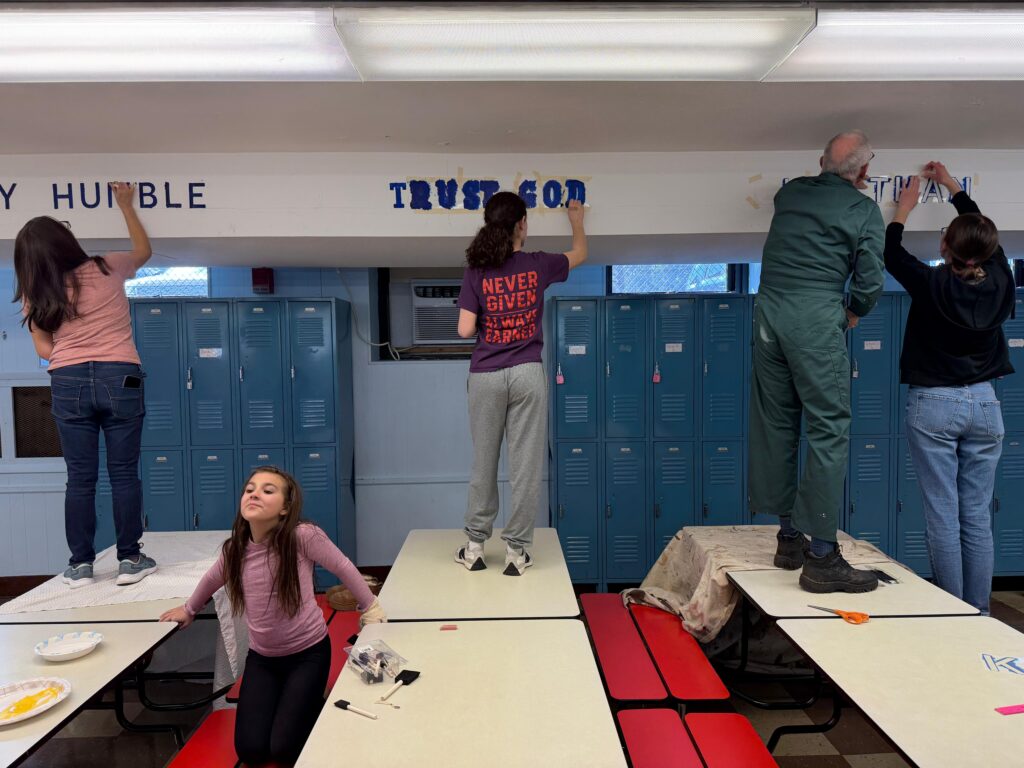 The upper school team used paint to enhance the caefteria and stairwells of SJS