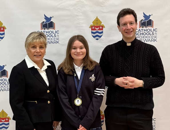 Dr. Valenti and Father Christian with Victoria Samulka, SJS student and recipient of the 2026 Outstanding Catholic School Graduate award (Mar. 2026)