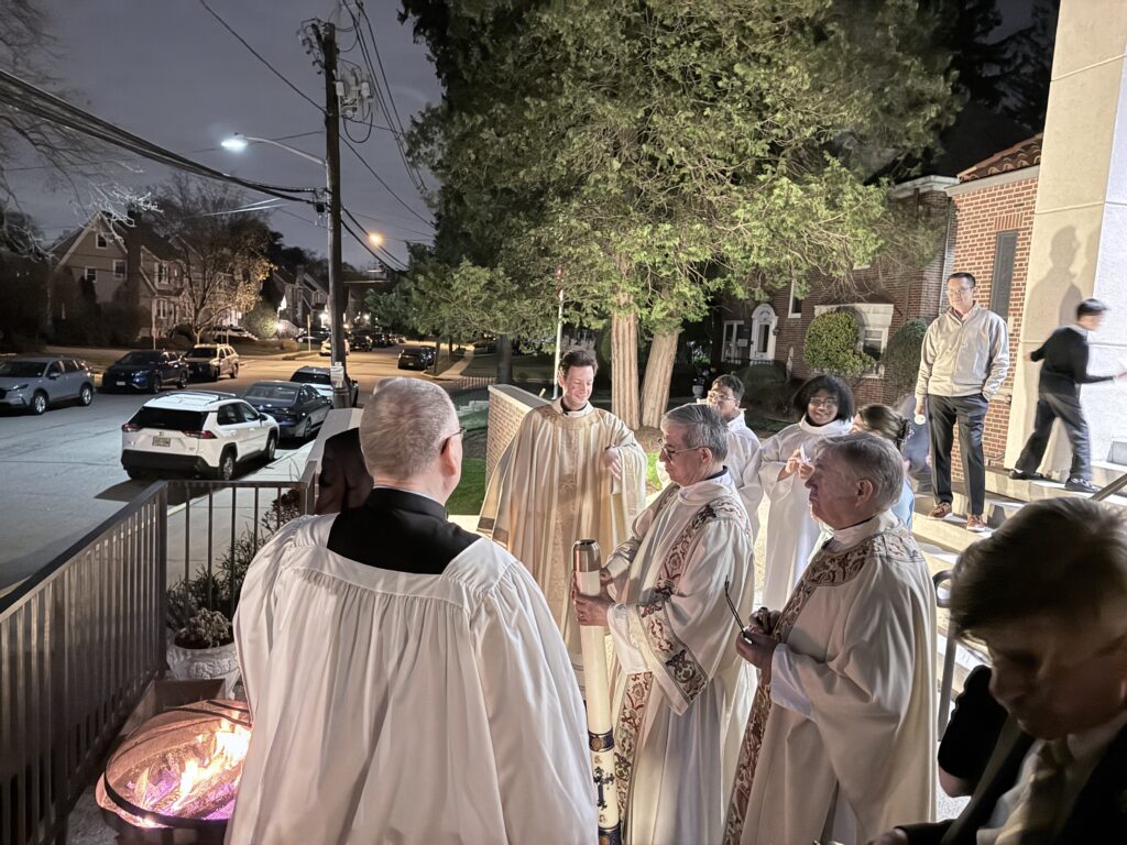 Gathering by the fire at the beginning of Mass (Easter Vigil 2026)