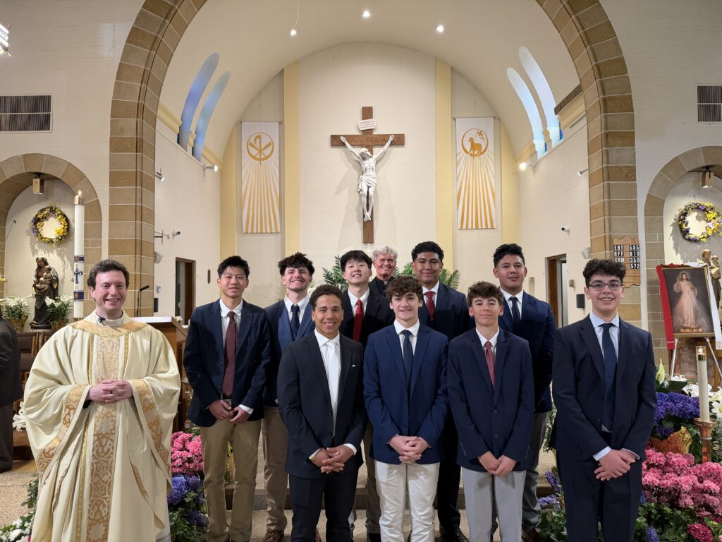 On Divine Mercy Sunday, 9 young people received Jesus in the Eucharist for the first time. The young men (8 from Bergen Catholic HS and 1 from SJ Religious Ed.) are pictured here with Fr. Christian and with Brother Gabriel (who prepared the young men from BCHS). Front Row (L-R), Michael Alberto, Jack Gonzalez, William Trimble, Sebastian Camaj (SJ RE); Back Row (L-R), Brandon Chu, Colton Canella, Jonah Shin, Cruz Araujo, Adriel Castellanos. Blessings on them all as they continue their faith journey and prepare for the Sacrament of Confirmation. (April 2026)